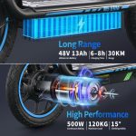 Powered by a 500W motor and a 48V 13Ah lithium battery, this scooter offers a 30km range and reaches speeds of up to 20km/h.
